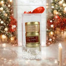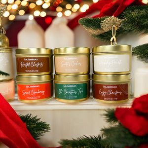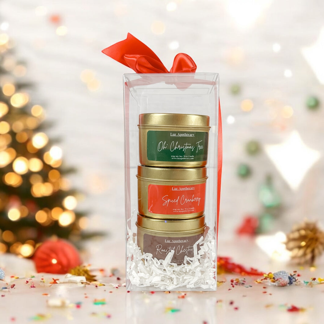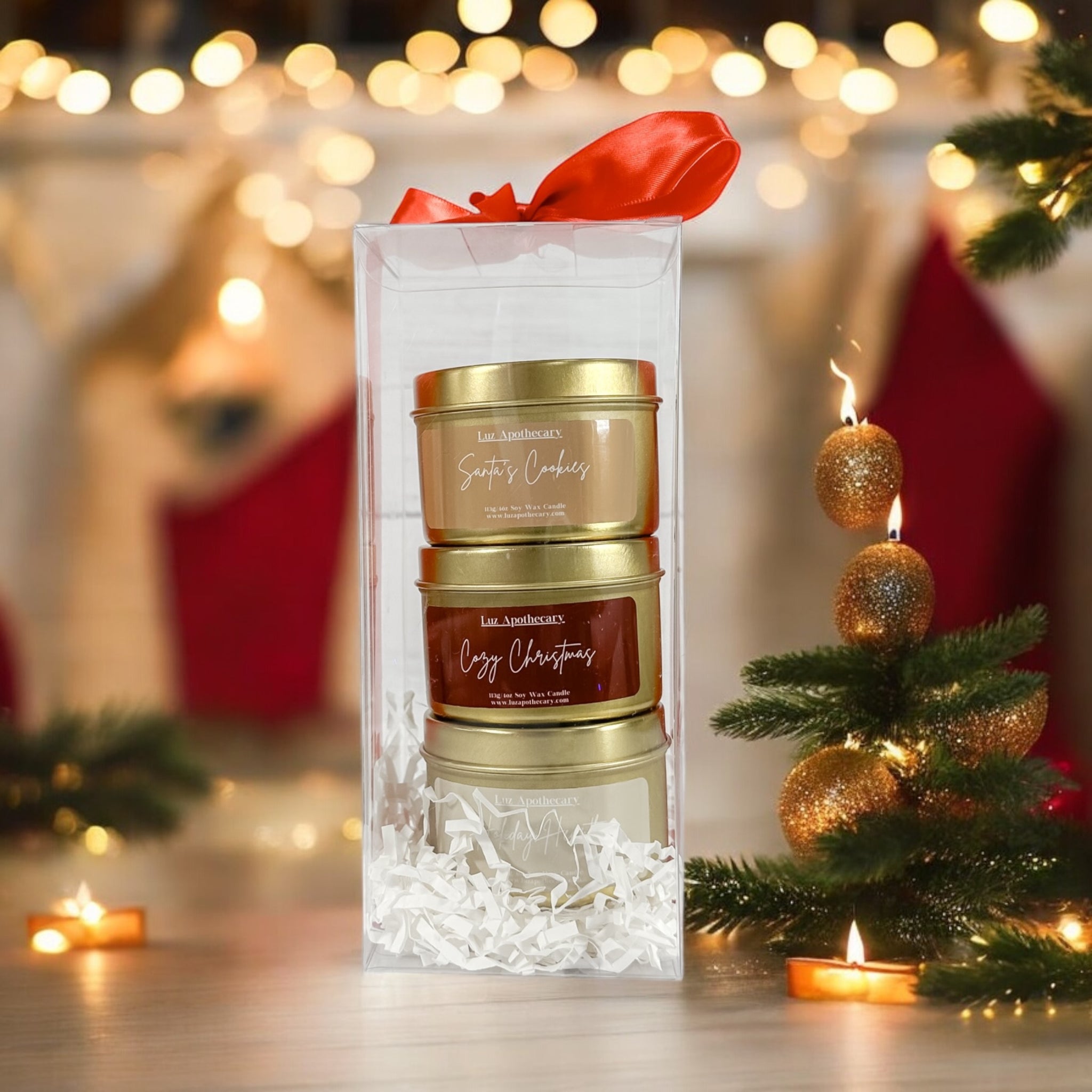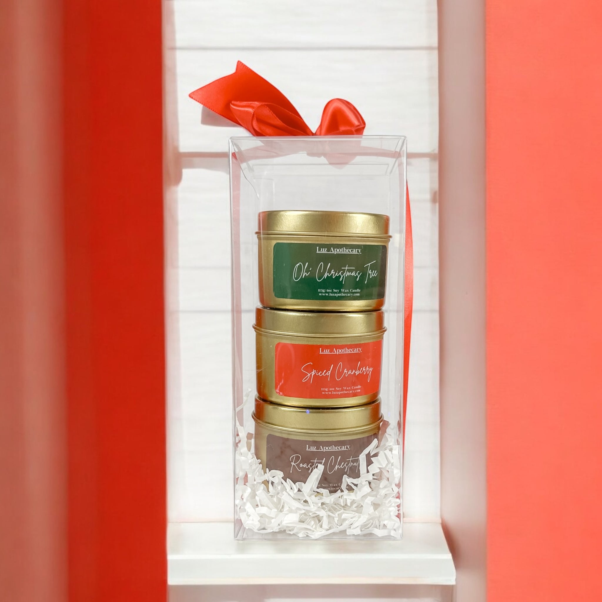 Create your own bundle by choosing three of our 4oz Holiday Candle Tins. They come wrapped in a clear stand alone container with a red ribbon on top. These make great gifts for friends, family, and acquaintances.